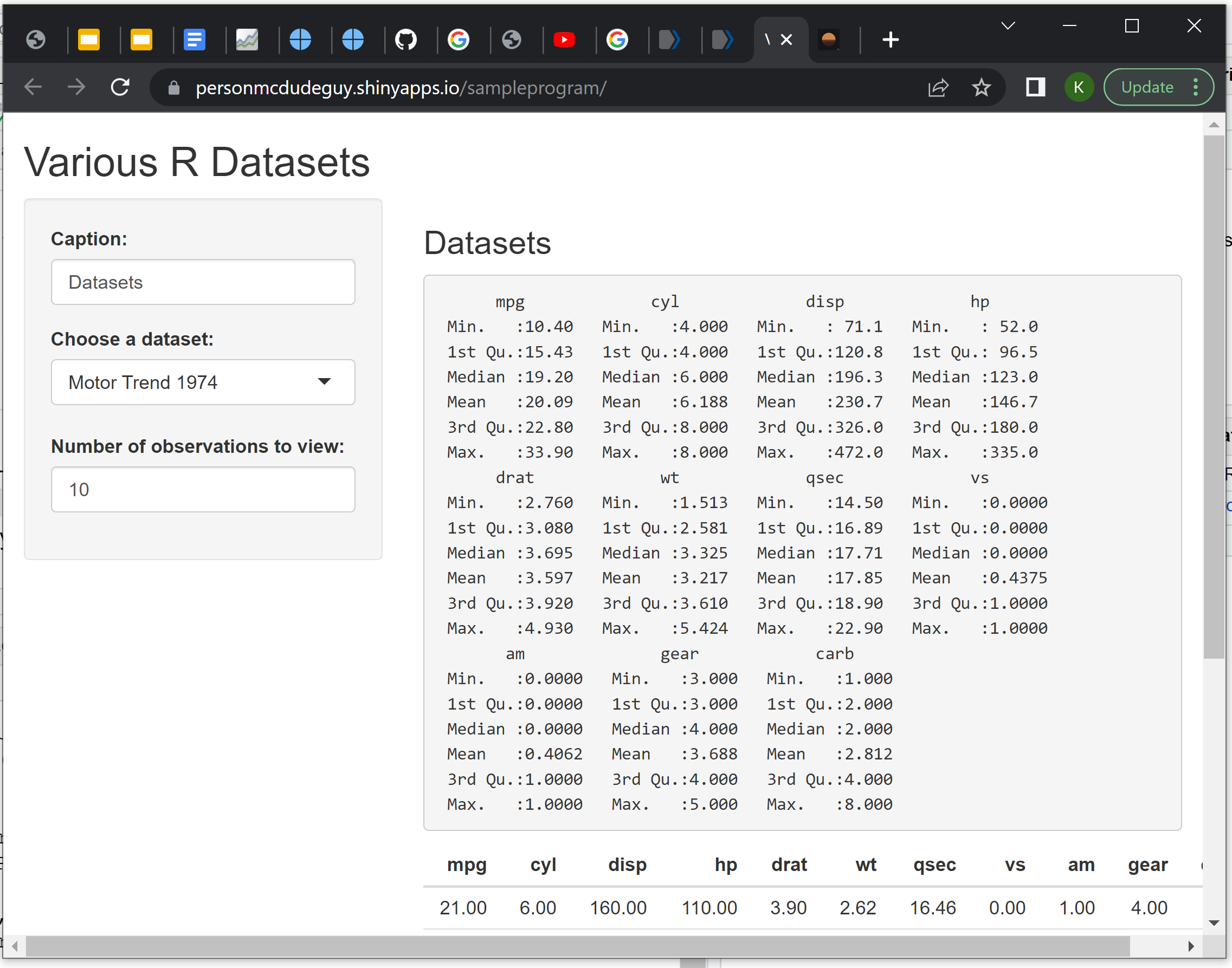 mtcars, USArrests, and uspop that are built into R. It displays a summary of the variables and a user-specified number of observations.